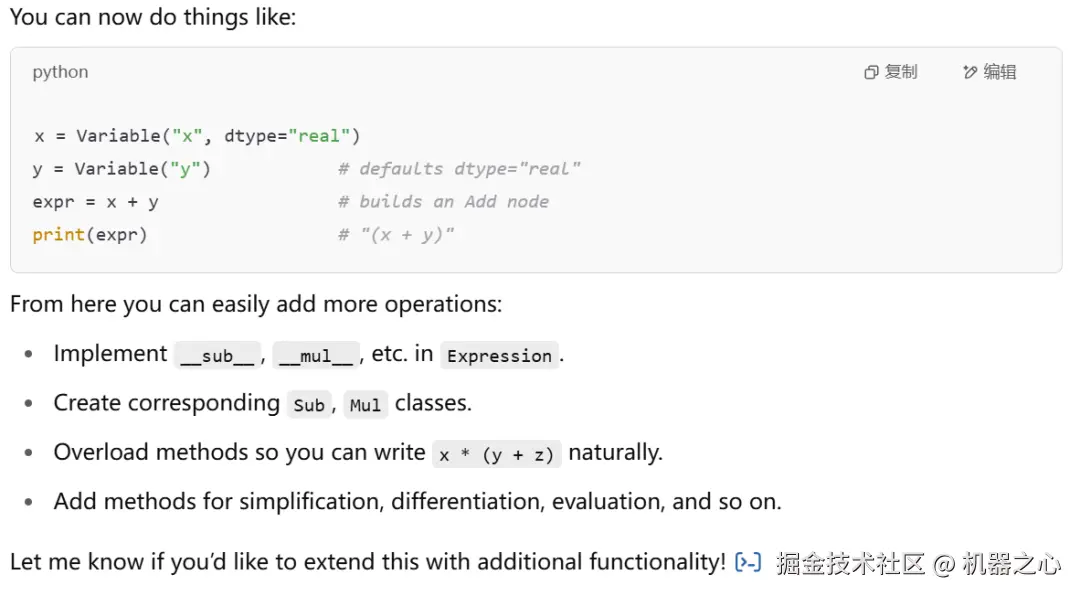 一开始,陶哲轩就对 ChatGPT 提出了自己的需求:「我想编写一些 Python 类来操作符号表达式。并且希望有一个表示变量的类,比如 x、y、z…… 你能帮我编写一些具有这种功能的基础类来入门吗?」