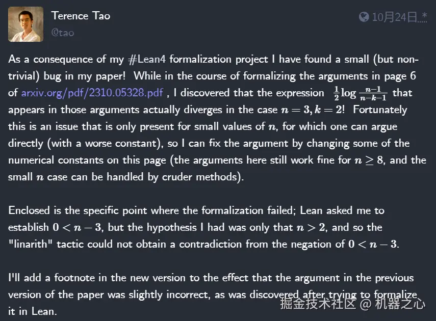 陶哲轩不止一次借助大模型进行研究,他曾在 GPT-4 的帮助下成功解决了一个数学证明题(GPT4 提出了 8 种方法,其中 1 种成功解决了问题),还在 AI 的帮助下发现了自己论文中的一处隐藏 bug。