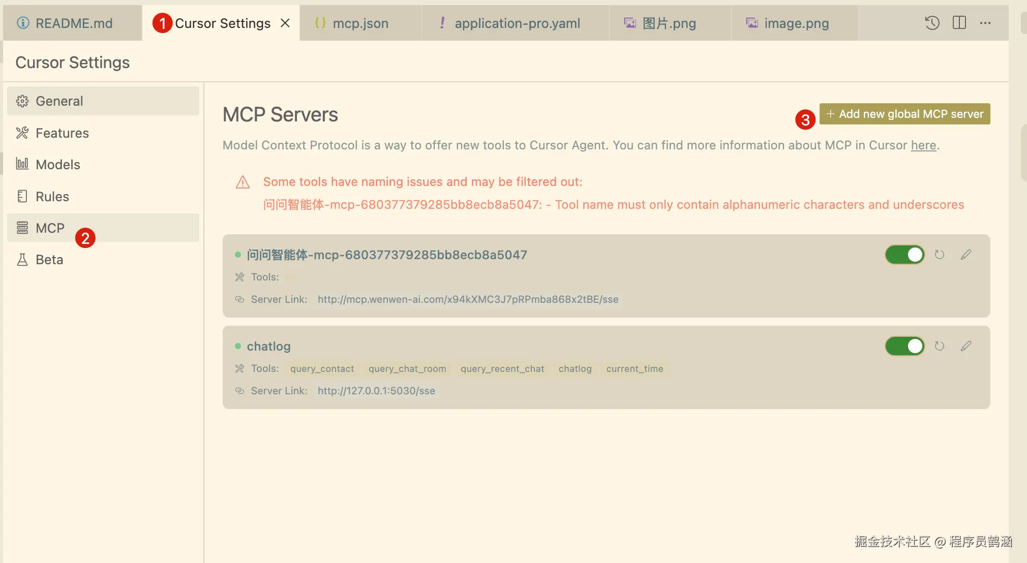 复制下面json到mcp.json中,看到亮绿灯的就集成成功啦