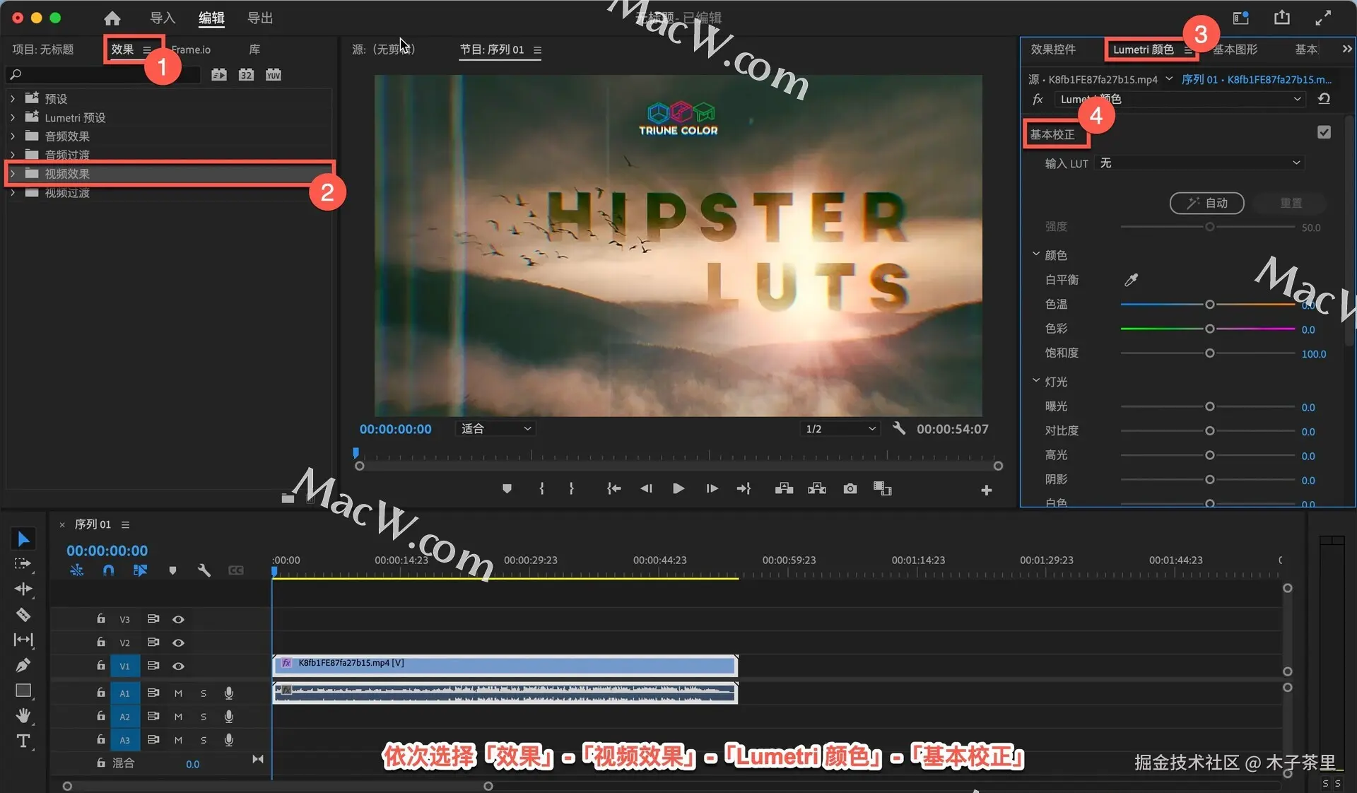 打开pr软件,依次选择「效果」-「视频效果」-「Lumetri 颜色」-「基本校正」。