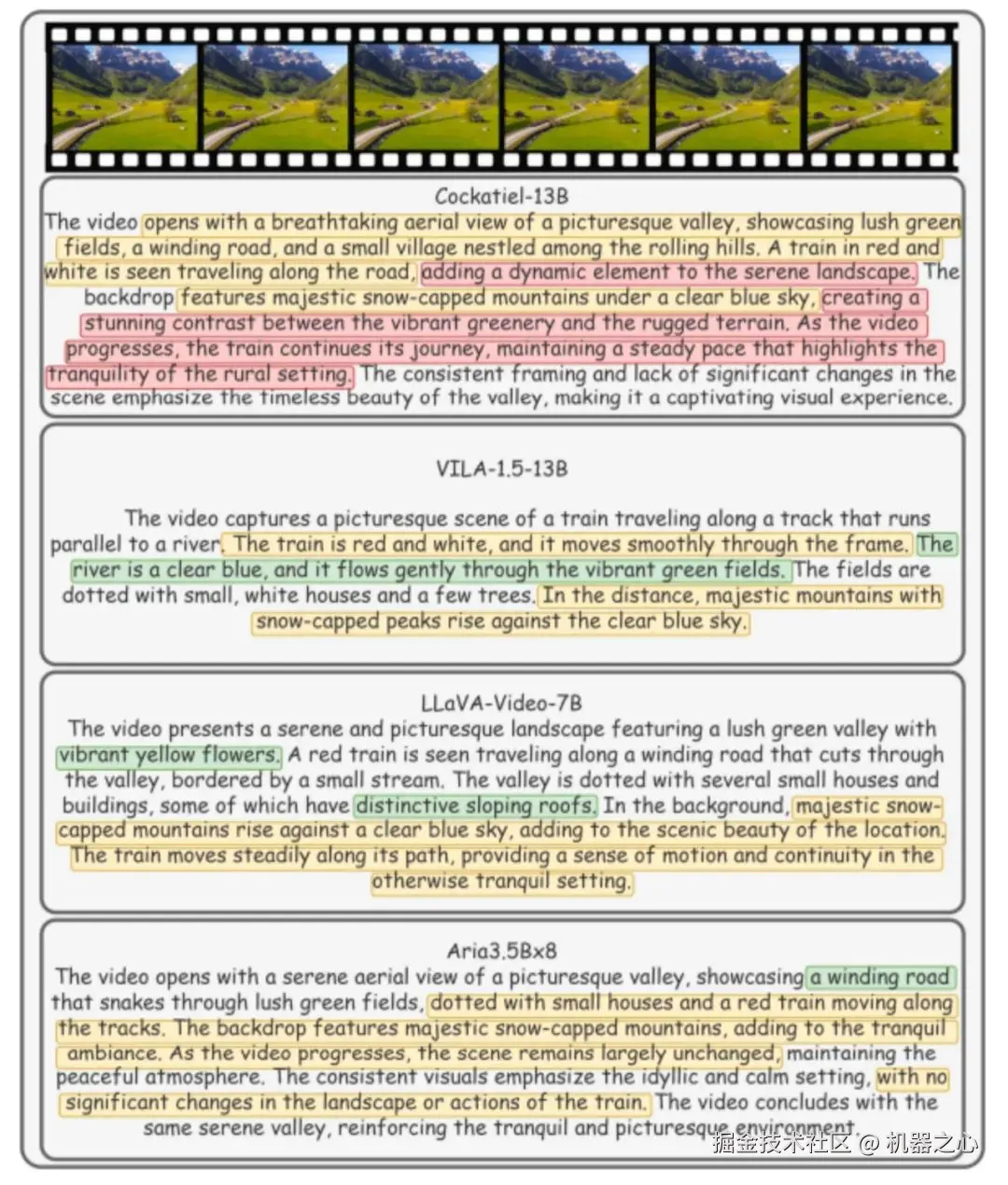 实验结果显示基于 Cockatiel 系列模型生成的视频细粒度描述,具备维度全面、叙述精准详实以及幻觉现象较少的显著优势。如下图所示,与 ViLA,LLaVA 和 Aria 的基线模型相比,Cockatiel-13B 不仅能够准确复现基线模型所描述的细节(以黄底高亮部分表示),还能捕捉到基线模型遗漏的关键信息(以红底高亮部分表示)。而 Cockatiel 生成的描述则大量避免了幻觉性内容,Cockatiel 展现了更高的可靠性和准确性。