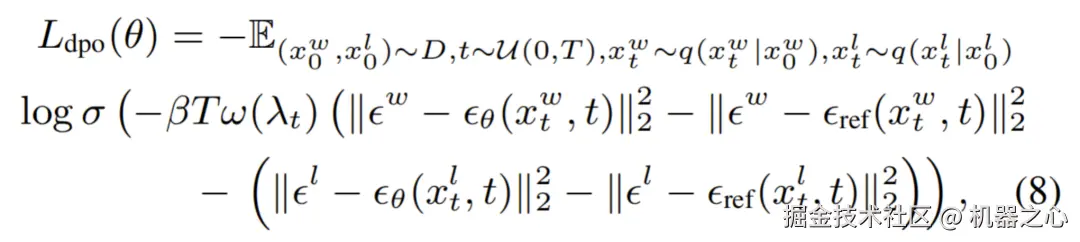阶段三:迭代强化学习优化:IPO 方法利用当前的视频生成(T2V)模型生成大量新视频,并由已训练的奖励模型对这些视频进行自动评价与标注,形成新的偏好数据集。随后,这些自动标注的数据用于进一步优化 T2V 模型。这一过程持续迭代循环,即:“视频生成采样 → 样本奖励计算 → 偏好对齐优化”。此外,我们提出的 IPO 框架同时兼容当前主流的偏好优化算法,包括基于对比排序的 Diffusion-DPO 方法与基于二分类评分的 Diffusion-KTO 方法,用户可灵活选择训练目标,其中两种人类偏好对齐方法(DPO 和 KTO)的训练目标为: