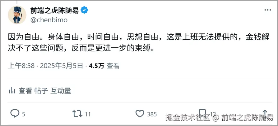 刚才我又去看了下,浏览量已经 4.5万,点赞数 385 了,说明很多人是比较认可这个观点的。