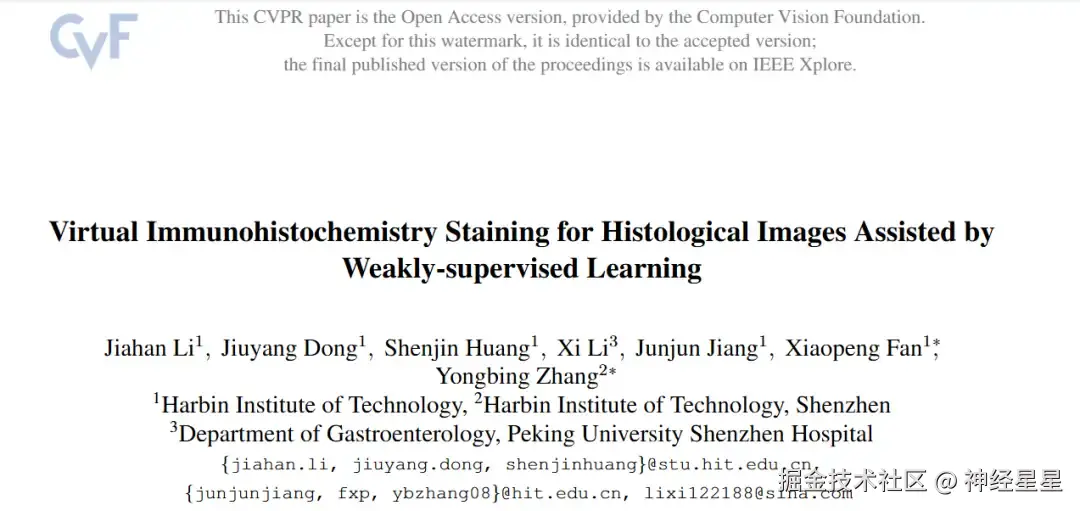 去年,CVPR 2024 就收录了一篇题为「Virtual Immunohistochemistry Staining for Histological Images Assisted by Weakly-supervised Learning」的研究,文章提到了一种名为 confusion-GAN 的弱监督学习方法, 用于虚拟免疫组织化学 (virtual immunohistochemistr, IHC) 染色,能将 H&E 图像转换为 IHC 图像,解决了传统方法在 IHC 染色上繁琐昂贵的代价。