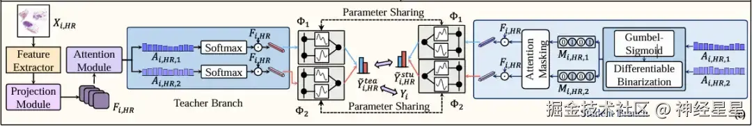 下图 b 所示为推理阶段, 具体过程可以分为三步:第一步是裁剪低分辨率 WSI (Xᵢ,ₗᵣ) 中的所有 patch,总数为 Nᵢ;第二步是将这些 patch 输入到 LIPN,以识别与分类相关区域,生成 Mᵢ,ₗᵣ;第三步是基于 Mᵢ,ₗᵣ 有选择性地裁剪 Xᵢ,ₕᵣ 中相应的 patch,然后将剩余的 patch 输入到特征提取器和 DMIN 中,最后通过跨类别的学生分支分别计算,生成最终分类结果。