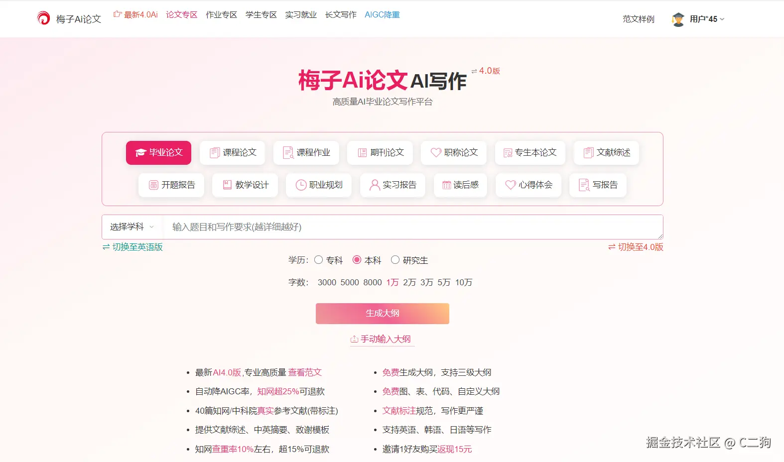 梅子AI论文,是专业的高质量智能AI生成器,支持图、表、代码,可自定义大纲。能无限次免费生成千字论文大纲,自动降低AIGC率,提供文献综述、中英文摘要、致谢模板,有超40篇知网/中科院真实参考文献,多篇致谢模板随机切换。