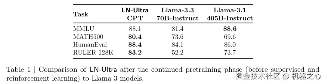 通过这一最终的预训练阶段,LN-Ultra 不仅实现了与基准模型 Llama 3.1-405B-Instruct 相当的性能,还在多个关键基准测试上取得超越,验证了即使进行激进的架构优化,也可通过短周期的蒸馏与预训练恢复并提升模型性能(见表 1)。