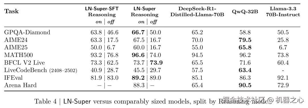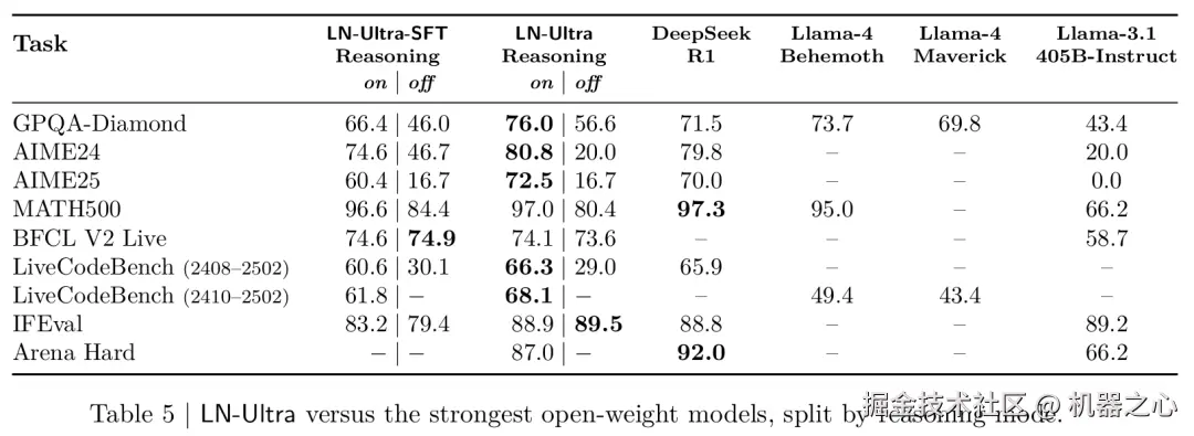 LN-Ultra 在推理类与非推理类基准测试上均达到或超越了现有开源权重模型的水平(如表 5 所示),证明通过从强大教师模型中蒸馏知识,模型可通过监督微调获得较强能力。