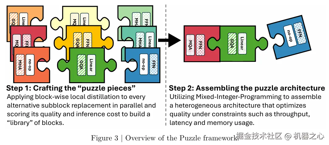 LN-Super 和 LN-Ultra 模型通过 Puzzle 框架实现高效推理优化。Puzzle 是一个神经网络架构搜索(Neural Architecture Search, NAS)框架,能够在真实部署约束条件下,将大型语言模型转化为面向硬件高效的变体,如图 3 所示。