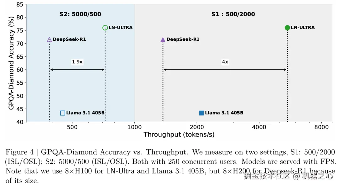 图 4 展示了两种设置下 GPQA-Diamond 准确率(%)与处理吞吐量(Token/s)的权衡曲线。值得注意的是,LN-Ultra 在准确率和效率方面均优于 DeepSeek-R1 和 Llama 3.1-405B,表明在精度 - 吞吐率帕累托曲线(accuracy-throughput Pareto curve)上,LN-Ultra 是更具优势的选择。