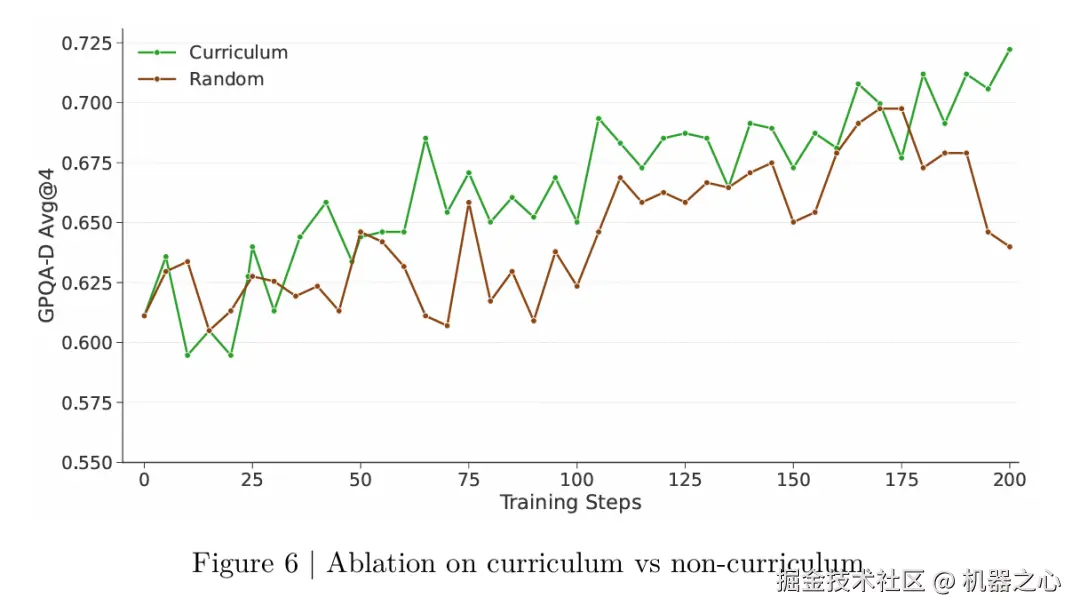 这种策略确保样本难度在 batch 层面逐步递进,同时 batch 内部保持随机性。图 6 展示了该课程式学习策略在降低方差、稳定训练过程及提升准确率方面的有效性。