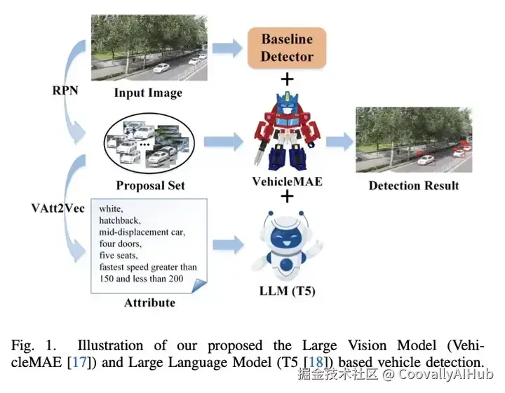 随着变形网络在许多领域的出色表现,一些研究人员开始考虑将变形网络与物体检测相结合。具体来说,基于 Transformer 的探测器和DETR首次将 Transformer引入物体检测。Zhu 等人提出了可变形注意力模块,提高了原 DETR 算法的训练速度和对小物体的检测性能。DINO 采用对比去噪训练和混合查询选择方法,进一步提高了 DETR 模型的性能。VITDET 使用 SFP 代替特征金字塔结构,消除了骨干网络的层次限制。与这些工作不同的是,在本文中,我们提出使用预先训练好的大型视觉和语言模型来增强车辆检测,并取得了明显高于我们基线的性能。