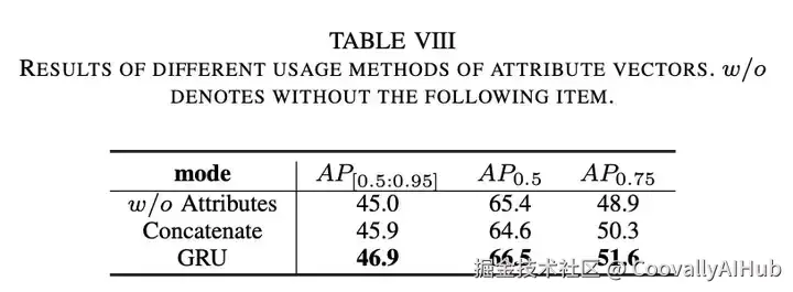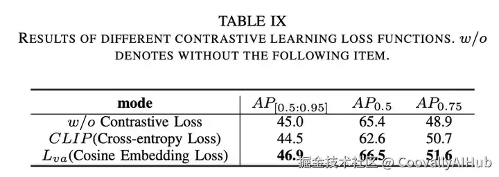 在本文中,为了缓解视觉特征与语义类别之间的语义鸿沟,我们提出通过对比学习的思路将视觉特征与统一的属性表示对齐。我们在表9中比较了两种对比学习损失函数,即CLIP损失和余弦嵌入损失。从结果来看,余弦嵌入损失在三项指标上达到最佳性能,分别为46.9%、66.5%和51.6%。然而,使用交叉熵损失会导致AP[0.5:0.95]和AP0.5指标下降。我们认为这是由于存在许多具有相同目标的候选区域,而交叉熵损失将批次内所有其他候选区域视为负样本。因此,我们选择使用余弦嵌入损失。