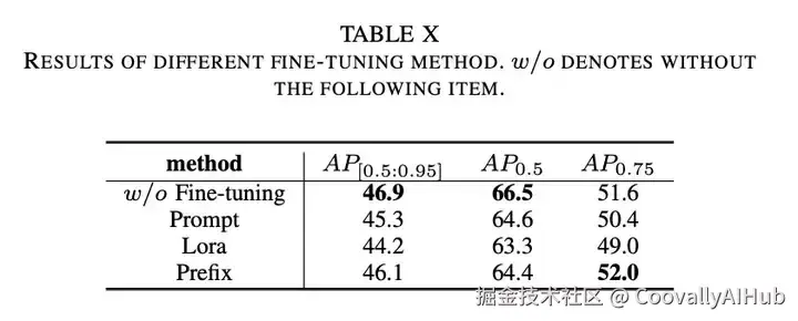 在我们提出的VAtt2Vec模块中,我们使用大语言模型T5获取车辆属性嵌入。在论文中,我们尝试对大语言模型使用不同的参数高效微调(PEFT)策略。实验结果如表10所示。当不进行微调时,模型在AP[0.5:0.95]和AP0.5指标上均达到最佳性能。相反,对大语言模型进行微调实际上会损害模型的性能。因此,我们选择不在模型中对大语言模型进行微调。