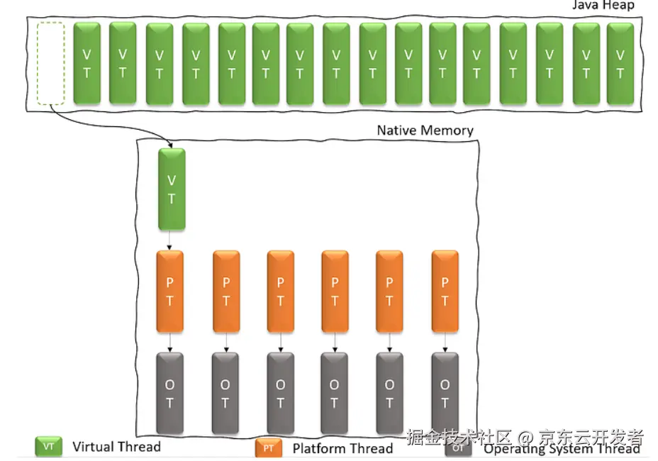 如上图所示展示虚拟线程与平台线程之间的关系: