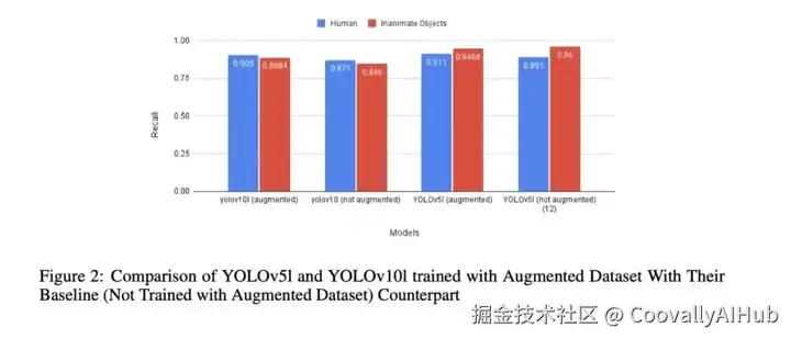 如图 2 所示,与基准YOLO模型(未经数据集增强训练)相比,我们的YOLOv10l-AD明显优于其基准模型,人类召回率从0.87提高到0.91。此外,与另一项在非增强型AFO数据集上训练YOLOv5l的研究相比,我们的YOLOv5l在检测人类对象方面的表现优于其基线版本,召回率从0.89提高到0.91。出现这种改进的一个可能原因是,增强型数据集增强了模型对亮度、色调和对比度等图像属性变化的鲁棒性,这可能是它们在处理陌生条件时整体性能提高的原因。