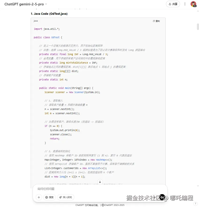 Gemini 2.5 pro完美的解答了此题,包含了Java代码、测试用例、解题思路、算法选择、其他语言的代码,并通过用例进行了代码测试,考虑了测试用例的边界线,提高算法通过率。