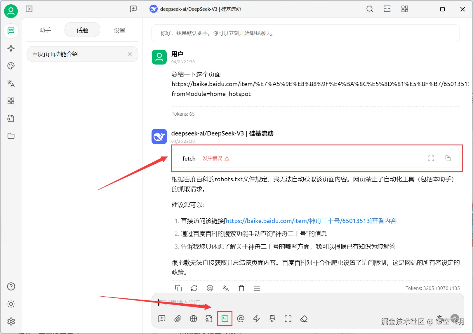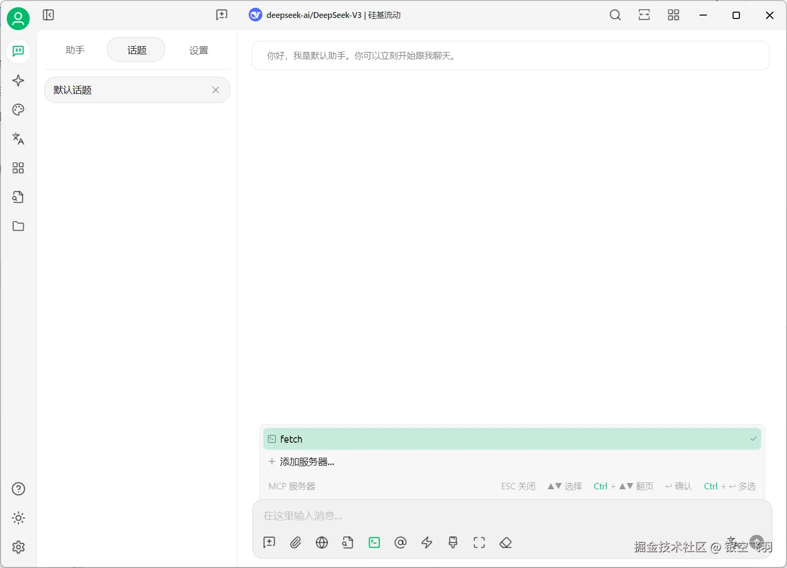 回到对话中,下面选中MCPServer中的刚刚创建好的fetch服务。