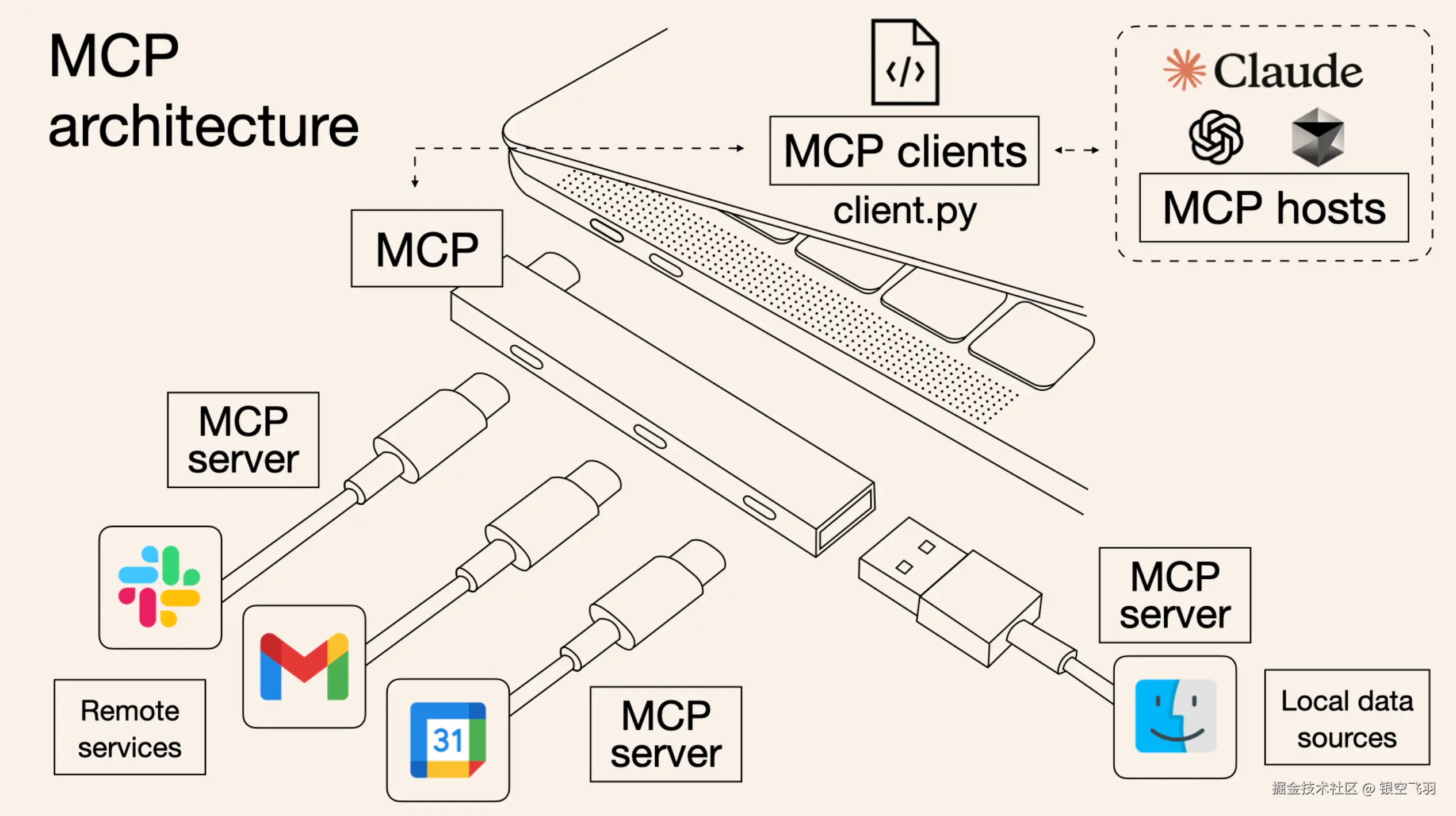 上面这个图,我觉得就很好的展现了MCP的一个角色定位,它就好比一个万能接口转换器,适配不同大模型工具平台,提供出一个标准的全网可直接接入的一个规范,也是通过C/S的架构,进行大模型服务调用。