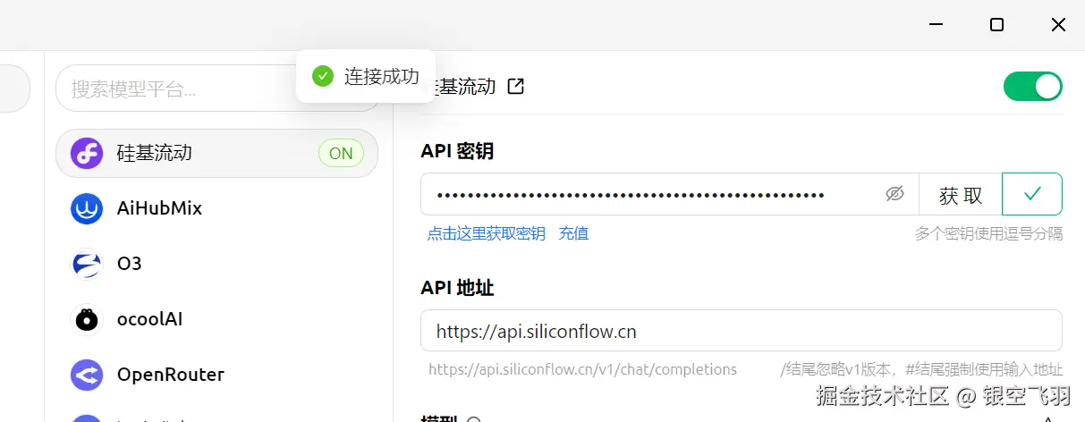 然后,我们需要配置一个模型,我们就用硅基流动的API(之前提到过,不过多赘述)