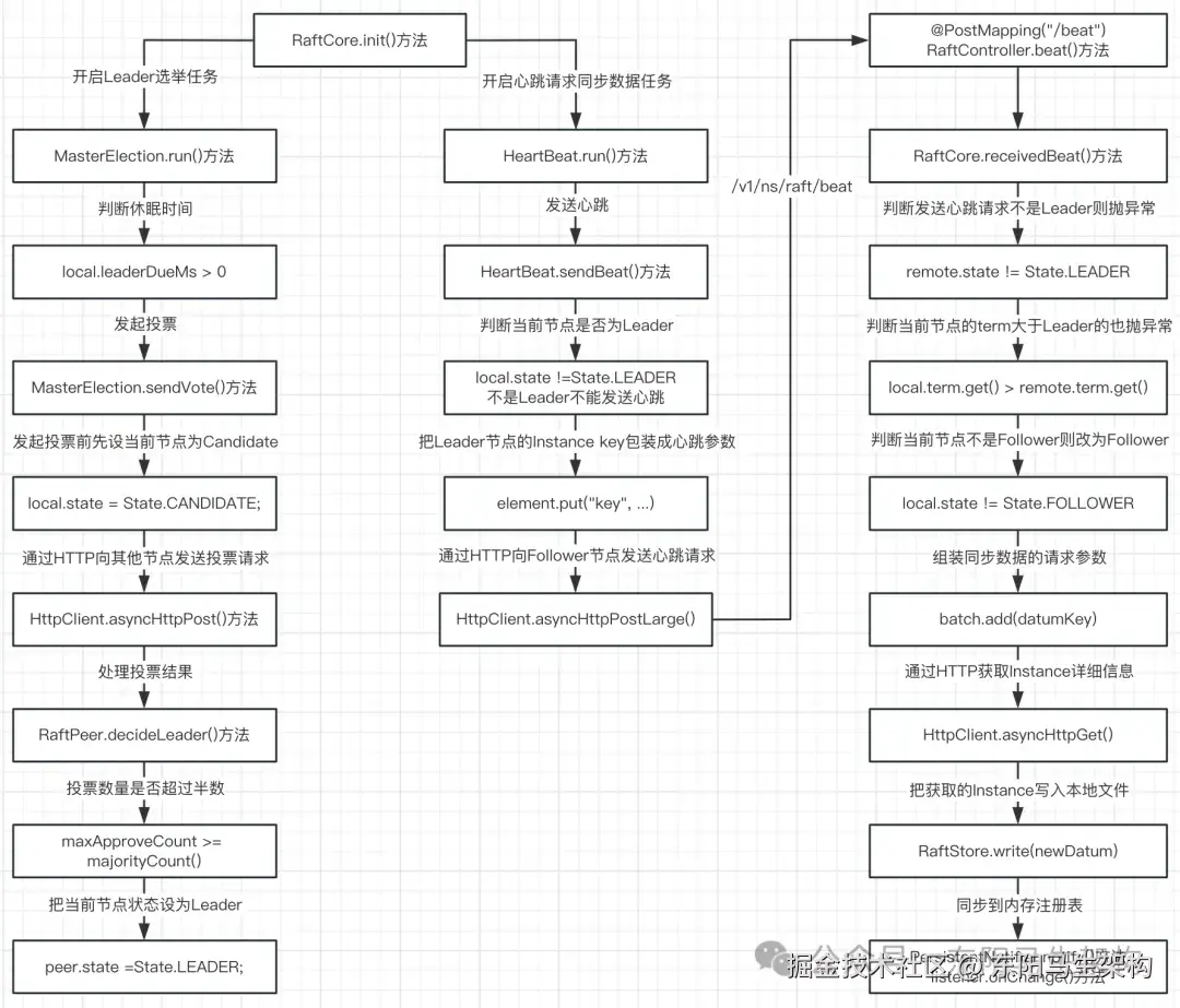 如下是Nacos实现的Raft协议处理Leader选举和通过心跳同步数据的流程: