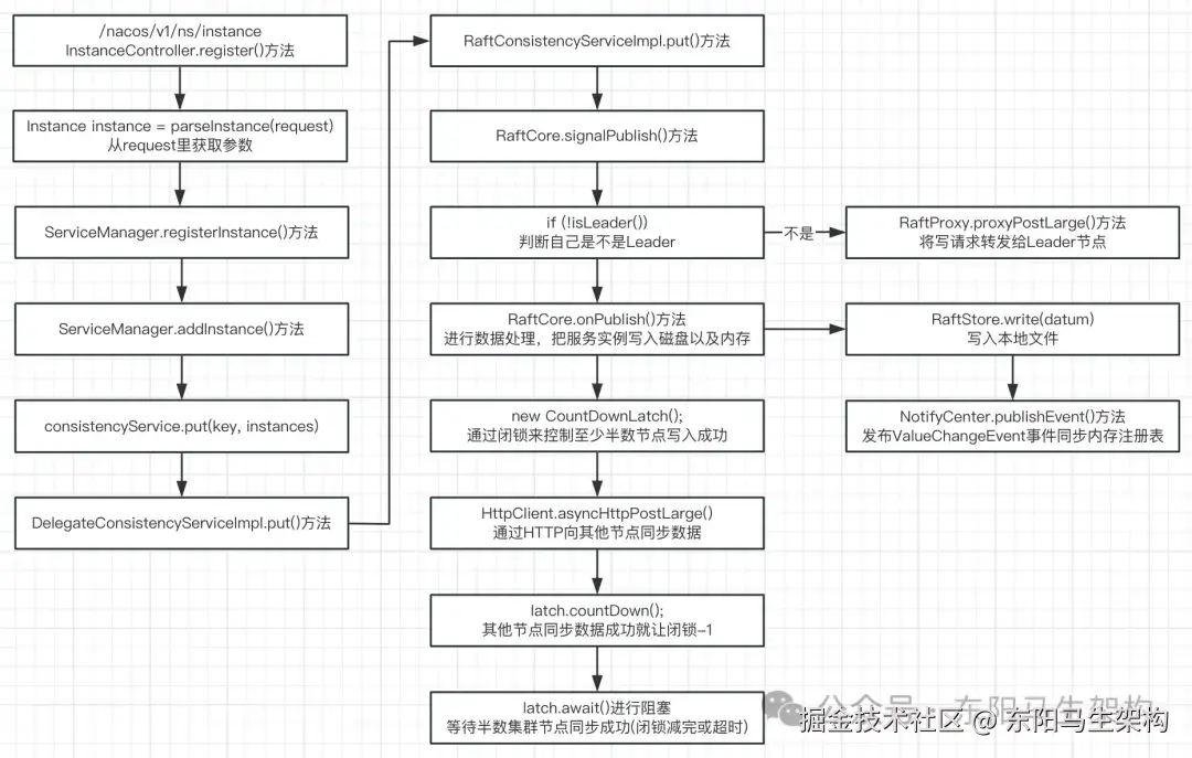如下是Nacos实现的Raft协议在注册服务实例时集群处理数据的流程: