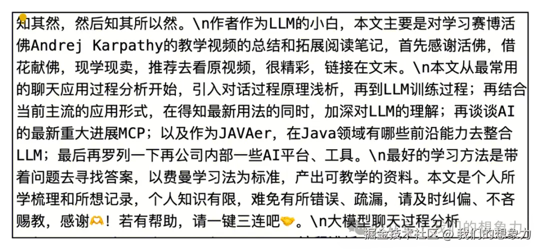 本文从最常用的聊天应用过程分析开始,引入对话过程原理浅析,再到LLM训练过程;再结合当前主流的应用形式,在得知最新用法的同时,加深对LLM的理解;再谈谈AI的最新重大进展MCP;以及作为JAVAer,在Java领域有哪些前沿能力去整合LLM;最后再罗列一些实用AI平台、工具。文章长1.5万字,可以慢慢看,欢迎评论交流。