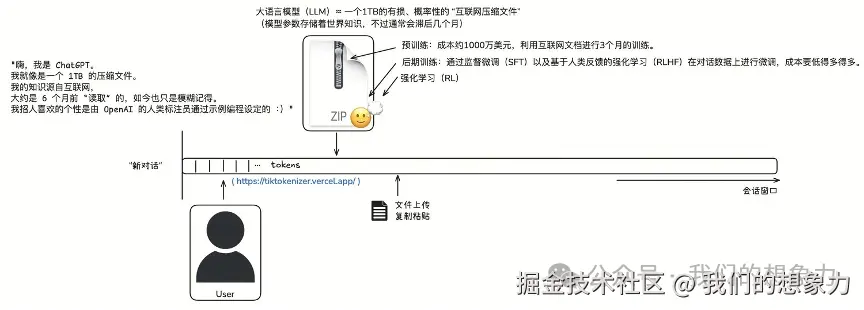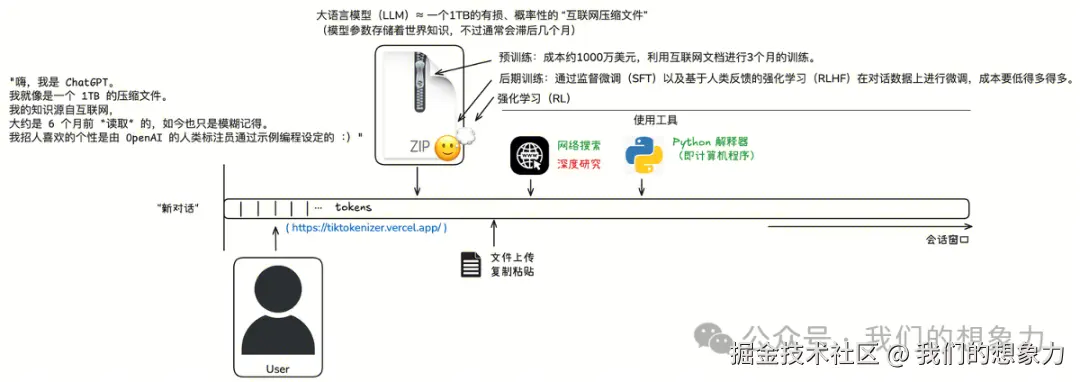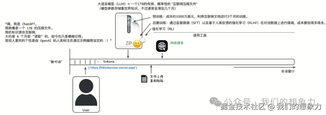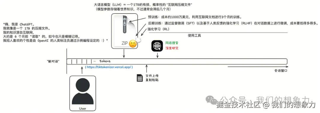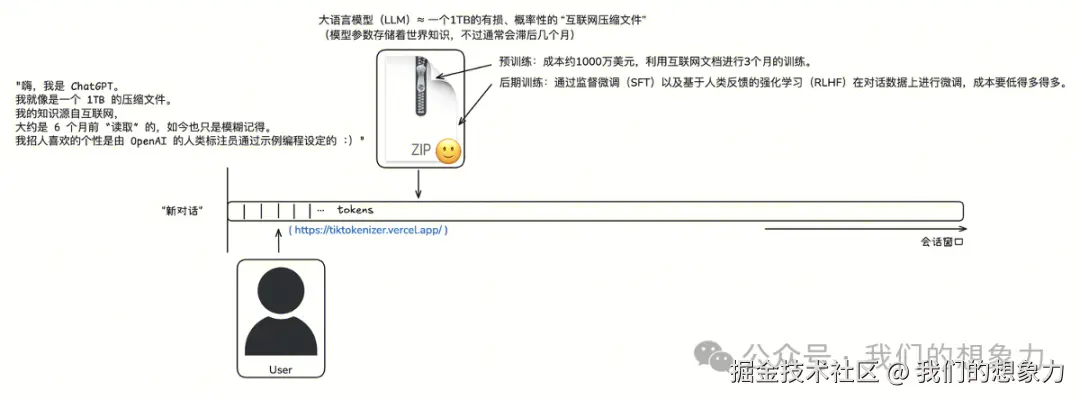 本质就是从输入的 tokens 推测下一个 token 的出现概率,将可能性较高的作为输出token,再将得到的token添加到输入中,直到满足结束条件(上下文长度限制、结束符以较高概率出现、用户定义的停止条件、概率阈值与采样策略、模型架构的隐式结束符)。 所以LLM本质上是一个具有统计概率的知识记忆模糊的知识回顾系统,也可简称概率性复读机。 那么这个回顾系统是怎么实现的呢,“zip文件”怎么得来的? 构建一个现代的LLM三个步骤:预训练、后训练(SFT)和强化学习(RL\RLHF)。