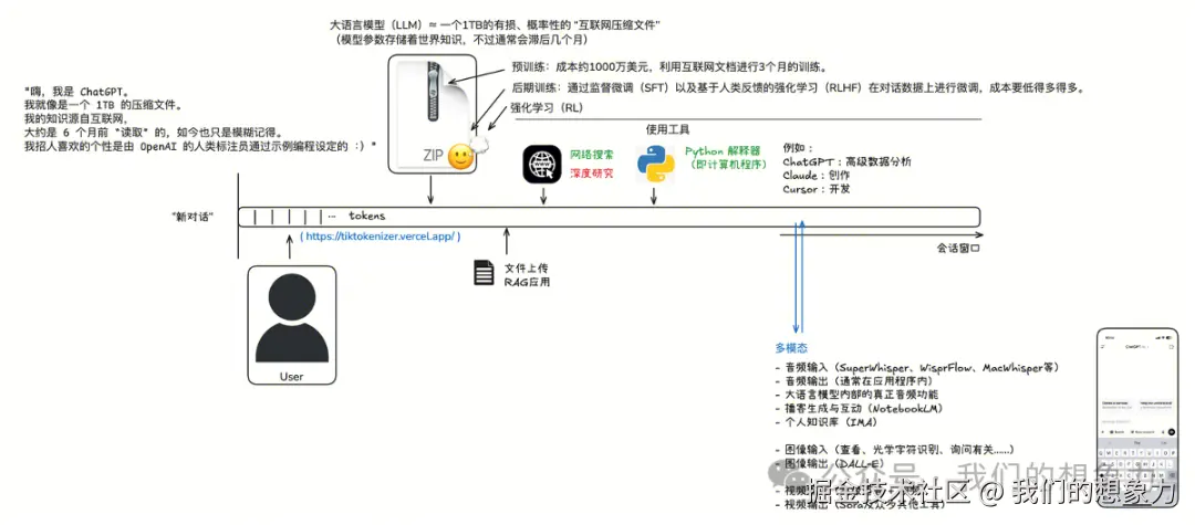 LLM是一个知识有损压缩的大文件,可以做到知识的回放,模型无法精确存储原始数据,但能生成符合统计模式的文本,也可能包含幻觉(错误信息),当前结合丰富的应用能力,可以绽放出万千形态。