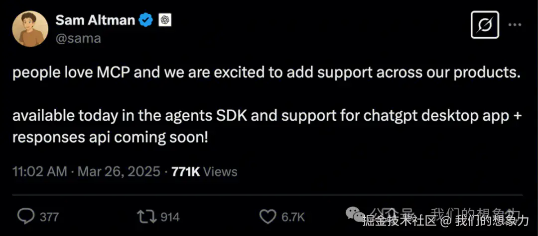 好多大公司都宣布对接MCP协议,OpenAI也对接了MCP协议: