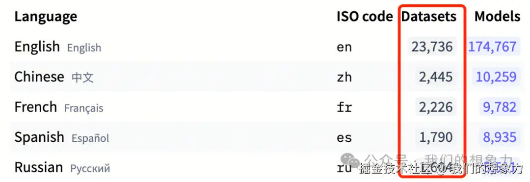 4.文本语言过滤,如仅针保留英文或者中文内容,在huggingface上数据集语言分布前5如下图: