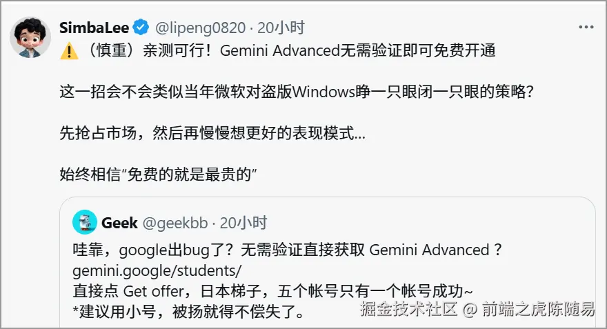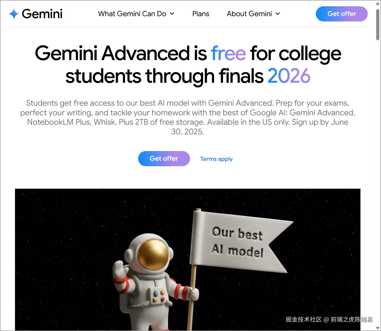 访问 gemini.google/students/,如果是美国 IP,即可免费领取一年的 Gemini Advanced,其实也就是 增强版 的意思。