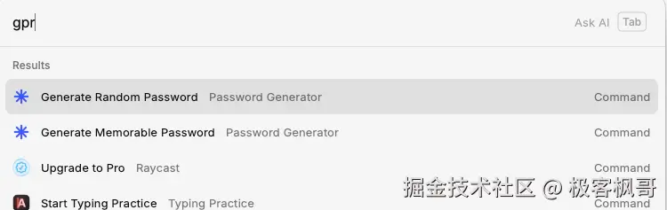 比如我唤起 raycast直接输入 grp,也可以找到 Generate Random Password
