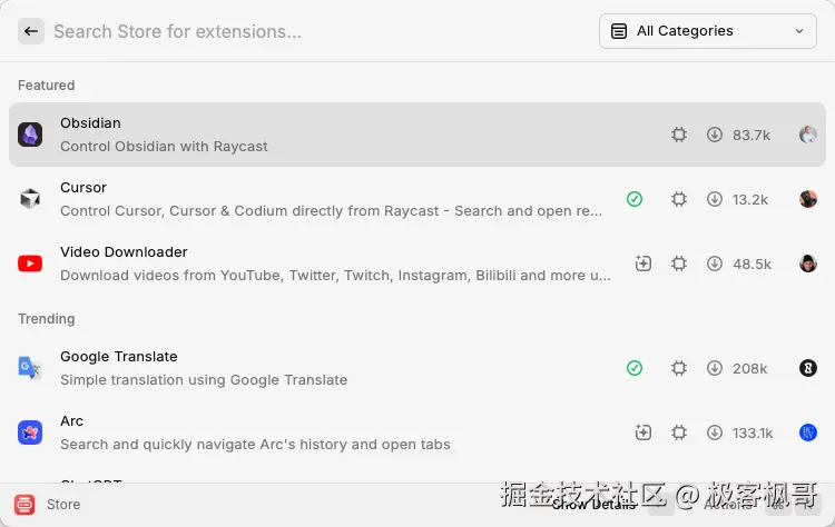 当然也可以在 raycast中安装 store插件,然后搜索插件