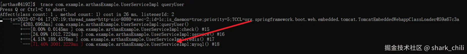 trace com.example.arthasExample.UserServiceImpl queryUser