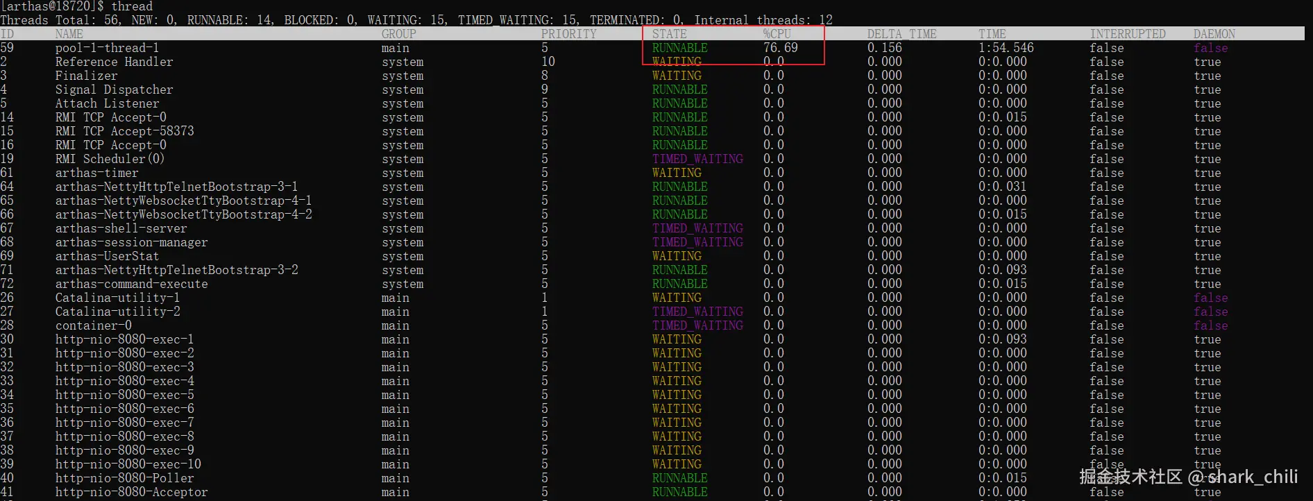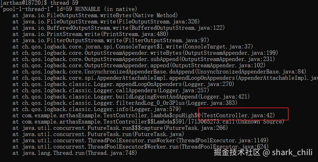 进入控制台,我们直接键入thread命令可以看到,有一个名为 pool-1-thread-1的线程CPU使用率非常高,所以我们需要定位它所工作的代码段。