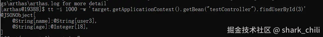 需要强调的是,tt 命令是将当前环境的对象引用保存起来,但仅仅也只能保存一个引用而已。如果方法内部对入参进行了变更,或者返回的对象经过了后续的处理,那么在 tt 查看的时候将无法看到当时最准确的值。这也是为什么 watch 命令存在的意义。