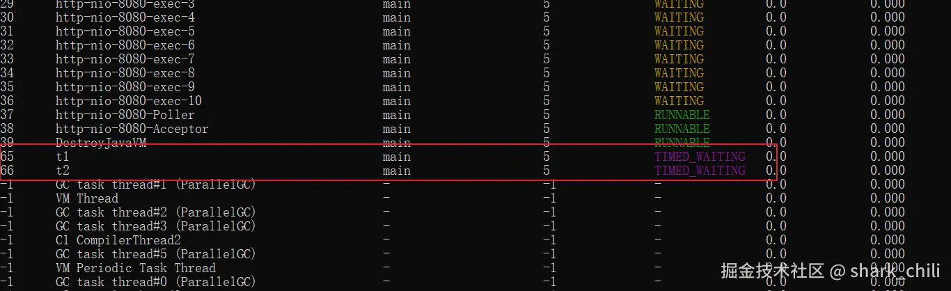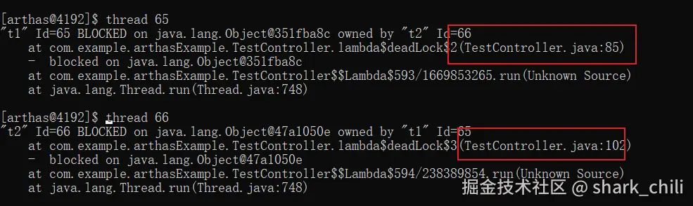 了解代码流程之后,我们直接调用这个接口,打开Arthas查看键入thread线程信息可以看到我们的t1和t2两个线程处于等待状态,大概率存在问题。
