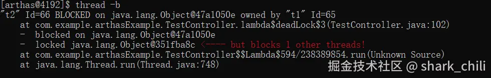 随后我们直接键入thread -b,发现t2线程被锁住了,由此断定这两个线程看定存在死锁,