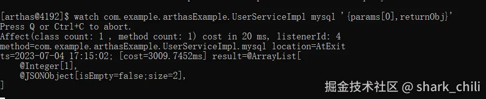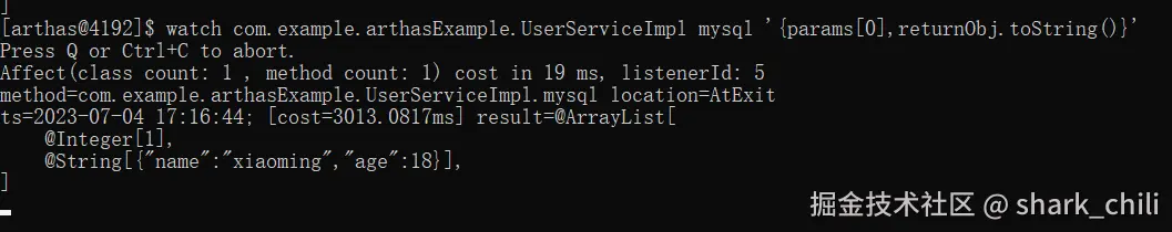 watch com.example.arthasExample.UserServiceImpl mysql '{params[0],returnObj}'