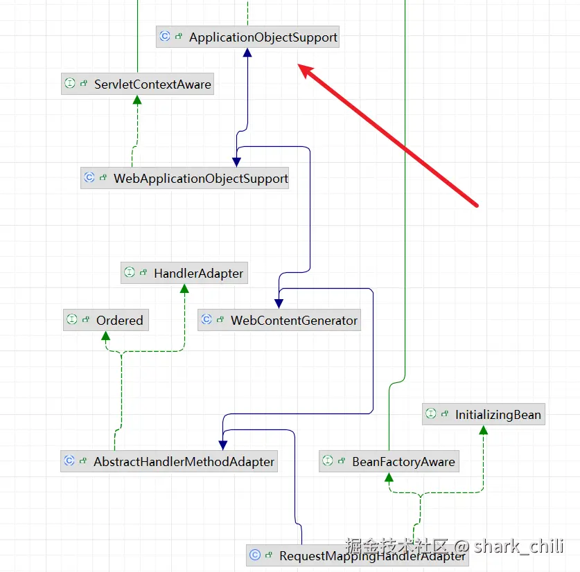 读过Spring MVC源码的读者可能都知道,每当又HTTP请求发送到web容器时都会进行请求进行映射转发处理时都会经过RequestMappingHandlerAdapter这个适配器上,查看RequestMappingHandlerAdapter的类图,可以看到它继承了WebApplicationObjectSupport,而该类有一个方法getApplicationContext它就可以直接获得Spring上下文,所以接下来笔者就演示如何通过tt指令获得RequestMappingHandlerAdapter从而调用getApplicationContext拿到上下文,开始各种骚操作。