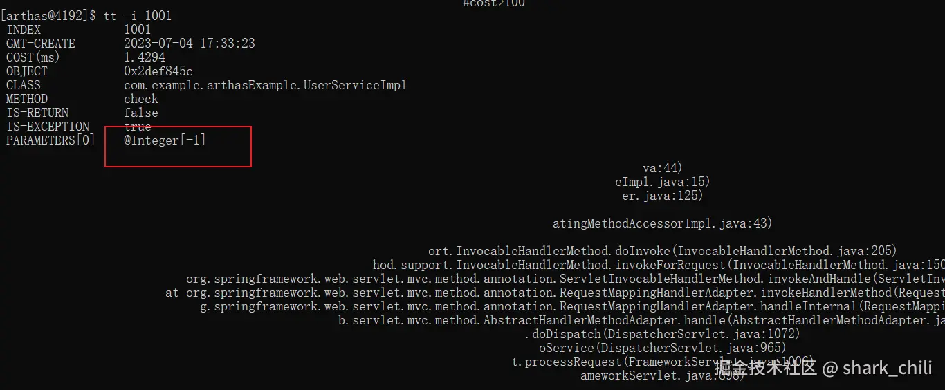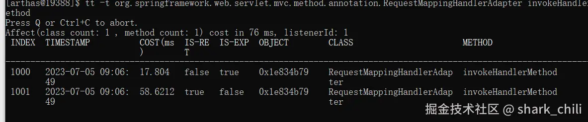 首先我们使用tt指令对RequestMappingHandlerAdapter 进行追逐,如下所示,笔者通过-t知名要追踪的类的全路径和方法,后续只要有请求调用该方法,tt指令就会显示追踪的信息: