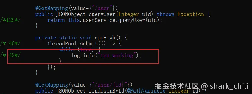 有了Arthas之后,问题的定位就会简单快速许多,为了演示这个例子,笔者编写了一段模拟CPU 100%问题的代码段: