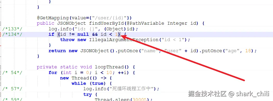 有时候我们测试难免会遗漏一些情况,如下所示,我们业务要求id小于1才抛出异常,但是我们因为粗心而将判断条件写成id<2,结果懵懵懂懂的就将这段代码部到了生产环境,导致业务查询出了问题。