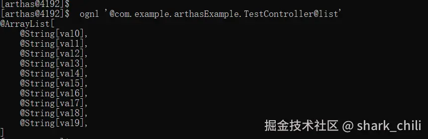 于是对应的指令我们可以改为ognl -c 68de145 '@com.example.arthasExample.TestController@list',而输出结果如下,可以看到变量的类型和数值都可以看到: