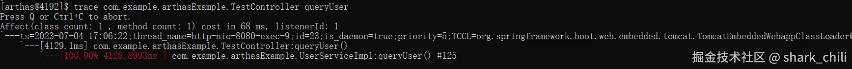 我们可以用trace命令,我们首先用trace追踪一下TestController 的queryUser耗时的调用: