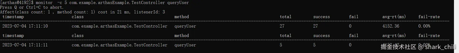 有时候我们希望监控某个方法单位时间内请求的耗时和调用情况,我们就可以使用monitor命令,例如我们希望每5s查看TestController 的queryUser的情况,我们就可以键入: