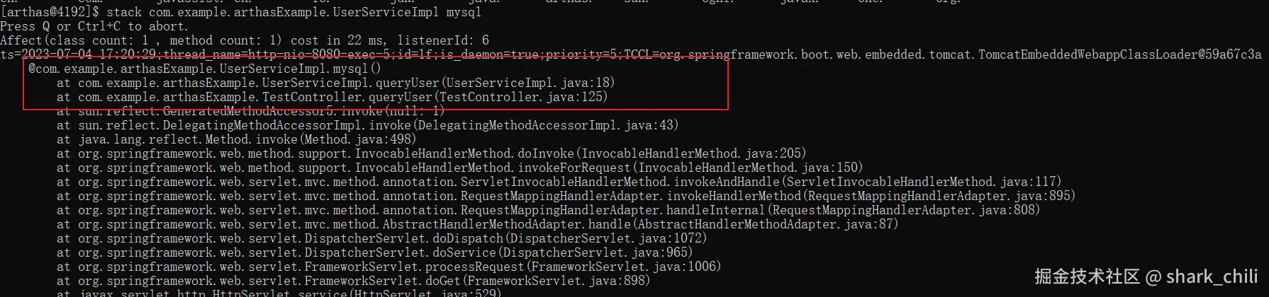 完成命令键入后,控制台就会阻塞监控这个方法,然后我们调用一下这个接口,可以发现原来是MySQL查询非常耗时,由此我们就可以进一步去推断问题了。