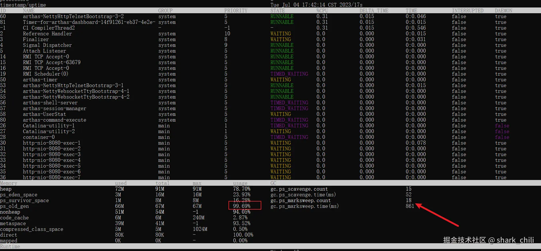 然后通过arthas发现老年代内存几乎已满,gc也十分频繁。