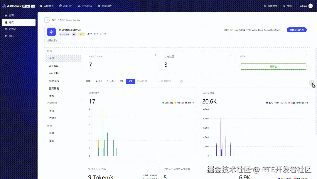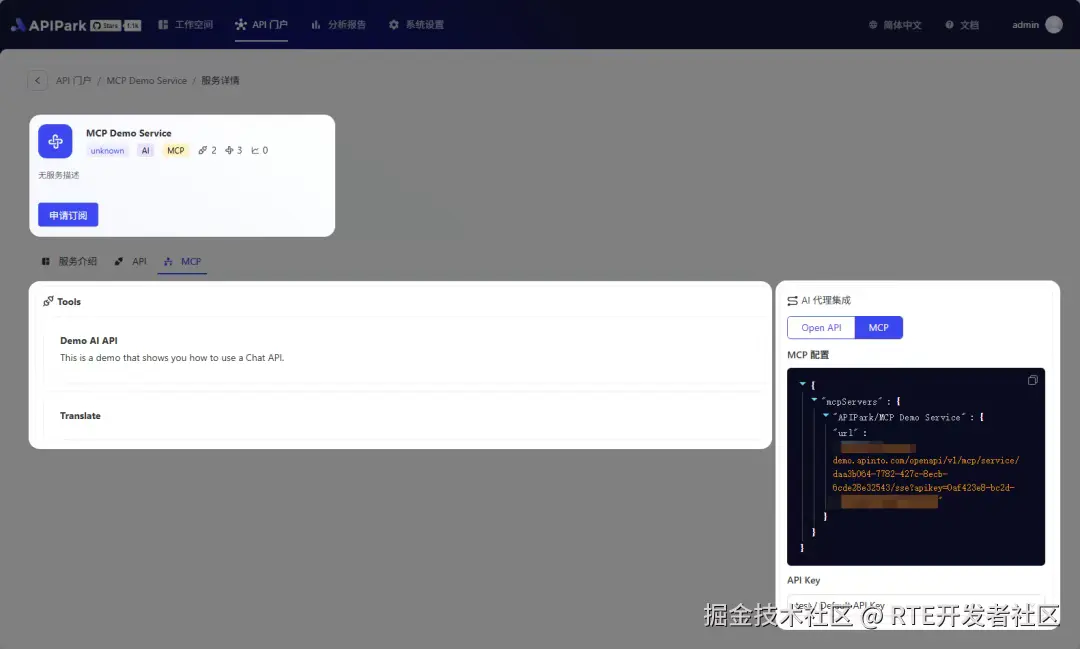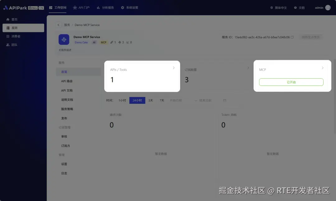 下图是开启MCP之后,服务的详情页会提示已经开启了MCP,并且显示当前MCP中包含的 API/Tools 的数量。